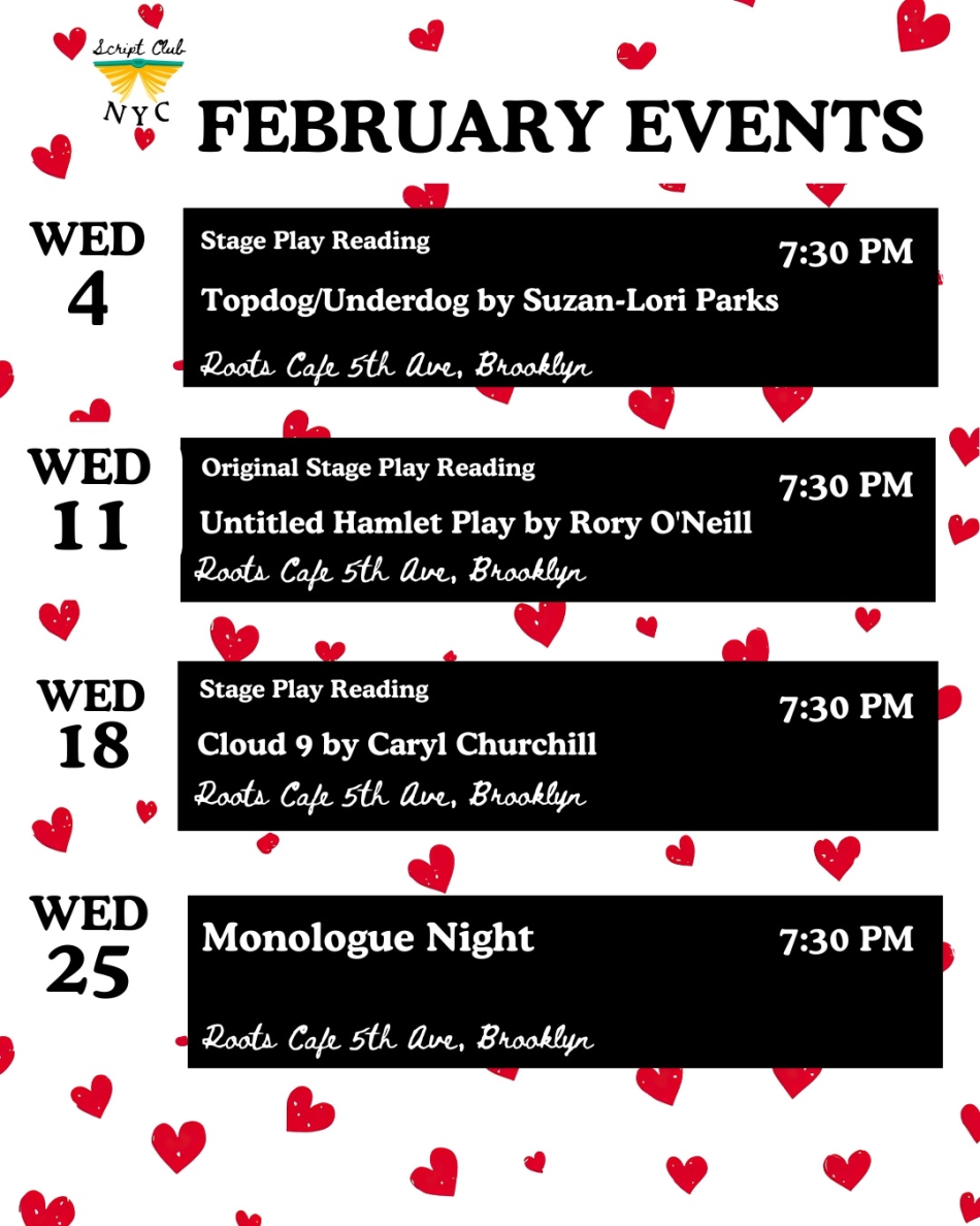 Script Club NYC has monthly events for every artist - weekly play readings, new screenplay feedback sessions, monthly hangouts, and monologue nights! Join us - we’d love to meet you!